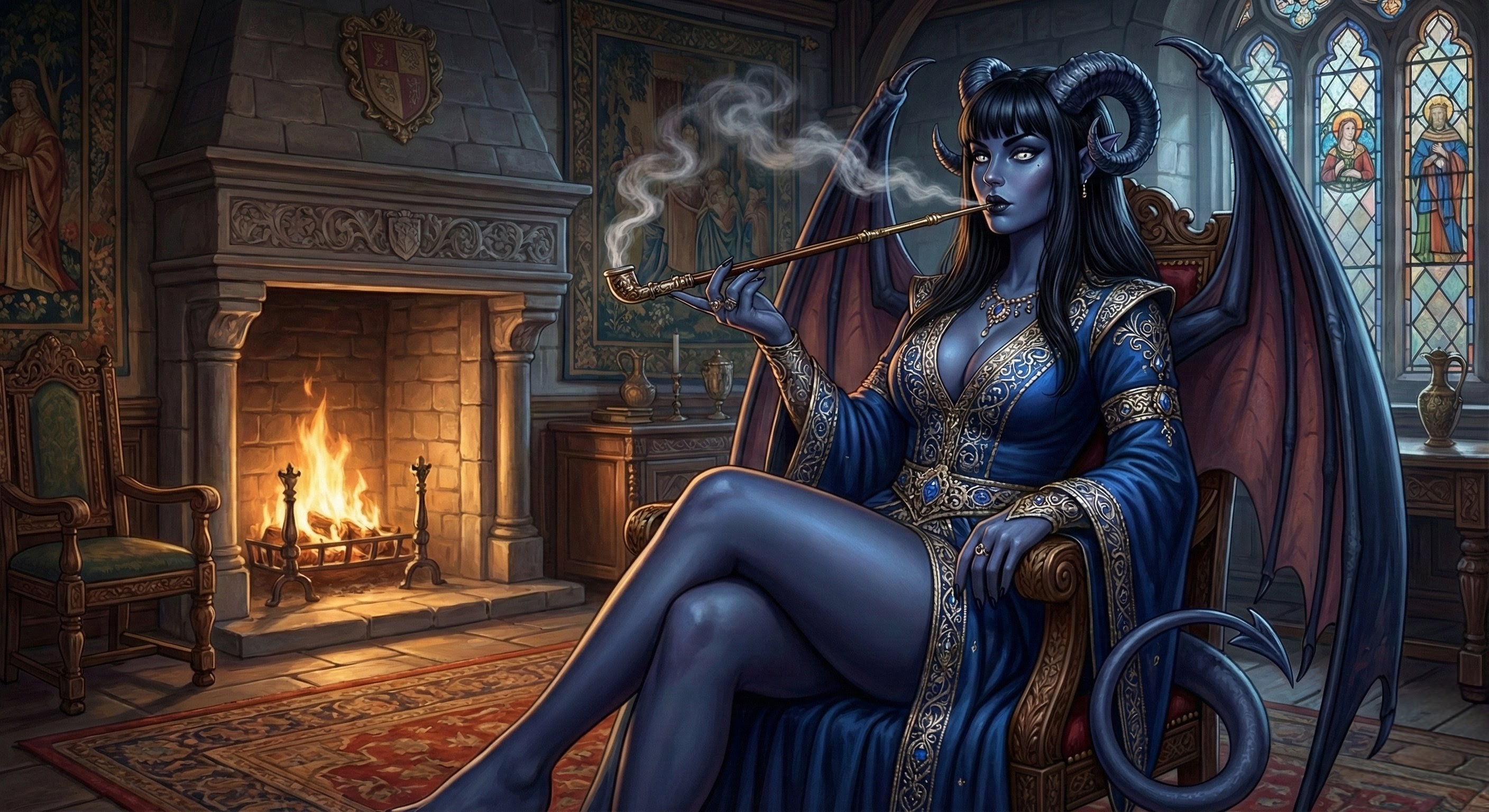 Erina era uma das cortesãs mais requisitadas e a favorita de Oliver, ela era uma Cornídea, uma raça tocada por heranças infernais, sua pele era de um azul profundo, e dois chifres curvos adornavam sua testa, rompendo a cascata de cabelos negros. Ela tinha olhos escuros como o abismo, 1,72m de altura, seios fartos e curvas perigosas. Mas o que realmente prendia a atenção de Oliver eram as asas e a cauda. Ela era uma humanóide alada, cuja envergadura, se aberta, seria o dobro de sua altura.